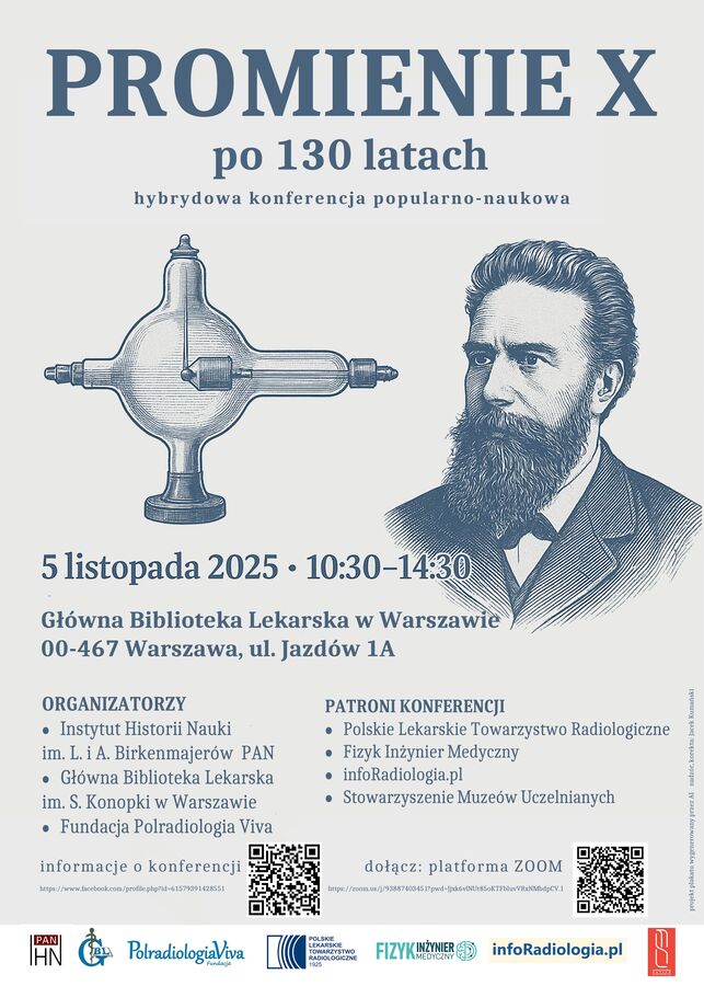 W listopadzie bieżącego roku upływa 130 rocznica odkrycia promieni X przez Wilhelma Roentgena. Odkrycie to w znaczący sposób zmieniło nie tylko medycynę ale także wiele dyscyplin nauki. Z okazji tej rocznicy chcielibyśmy przypomnieć o tym wydarzeniu i pokazać gdzie te niewidzialne promienie znalazły zastosowanie. Zapraszamy więc na sympozjum online, które odbędzie się w dniu 5 listopada w godzinach od 10:30 do 14:30. Prezentacje będą transmitowane z Głównej Biblioteki Lekarskiej w Warszawie. Poniżej link, który będzie aktywny w wyżej podanym terminie: